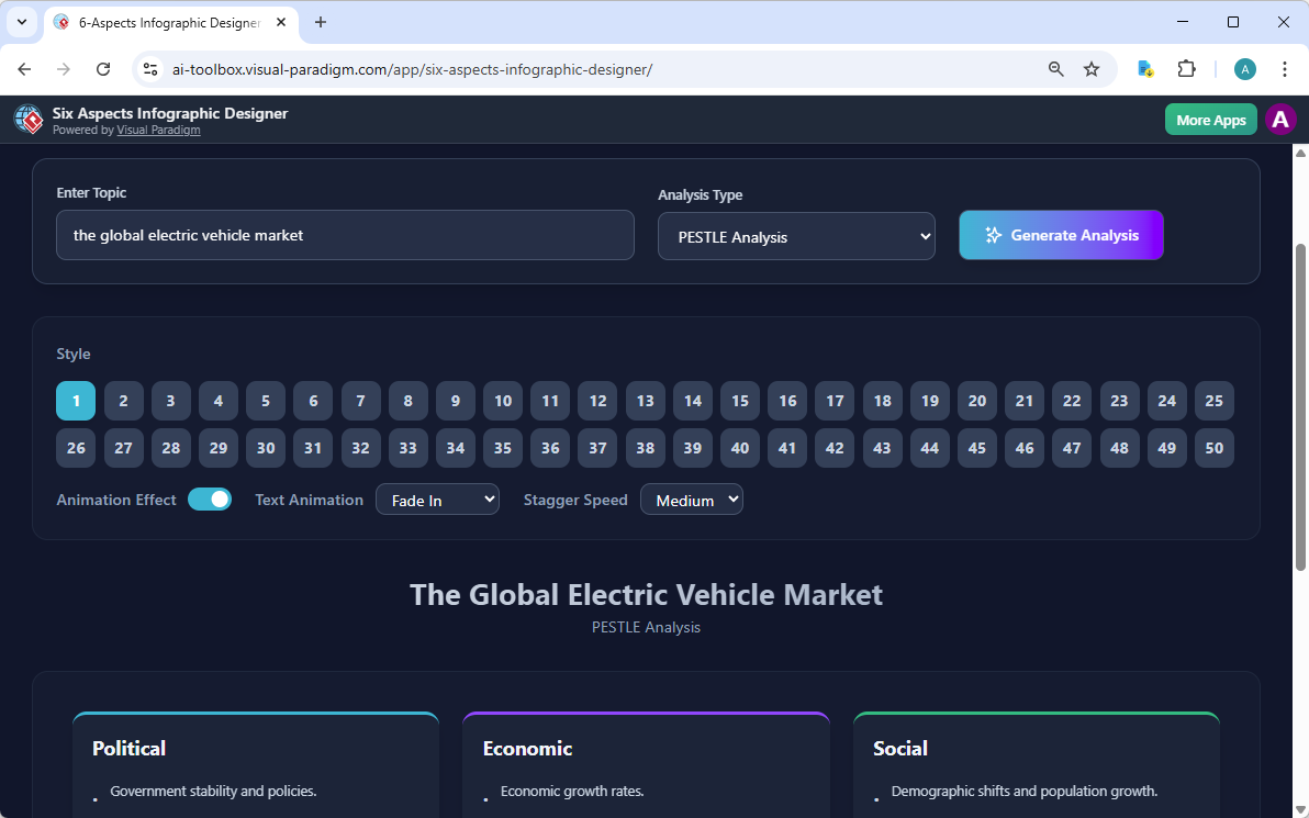 Visual Paradigm’s 6-Aspects Infographic Designer is purpose-built for six-factor frameworks like PESTLE, allowing you to transform detailed analyses into engaging, high-quality infographics with AI assistance. This tool excels at visualizing Political, Economic, Social, Technological, Legal, and Environmental factors in a balanced, professional layout.