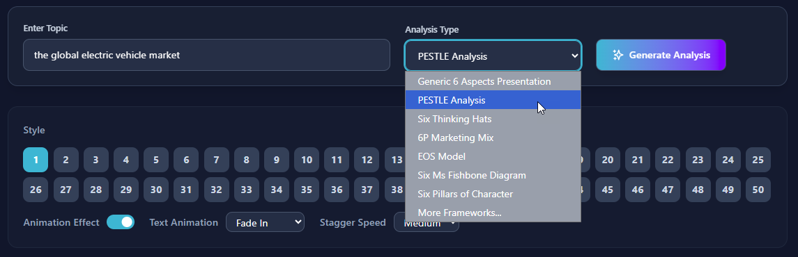 Enter your topic, e.g., “PESTLE analysis for the renewable energy sector in Europe.”. Click Generate Analysis.